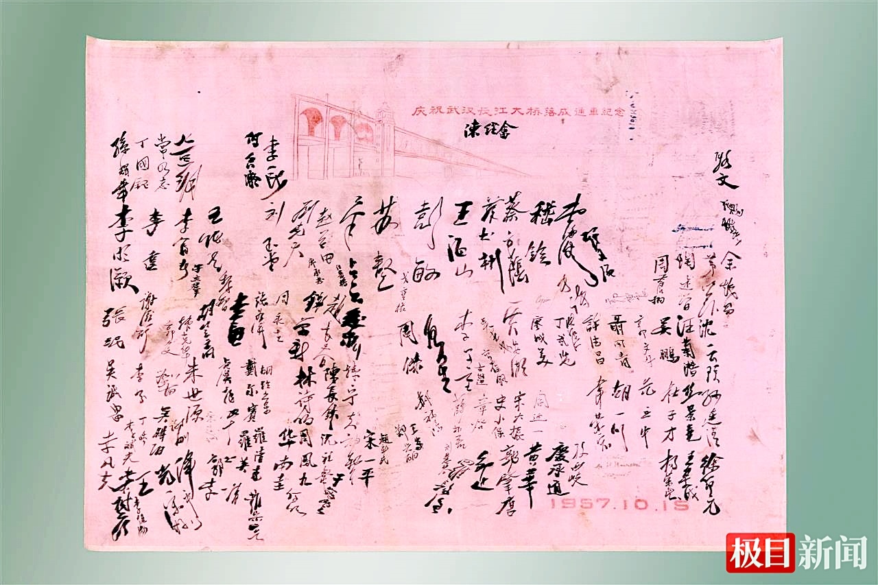 签名粉色丝绸 楚天都市报吉木新闻提供 通讯员照片(通讯员 邢莹) 一块布满数百个签名的粉色丝绸共同见证了新中国大桥建设的重要历史时刻。 10月15日,武汉长江大桥通车68周年,桥梁博物馆正式发布《1957年10月15日武汉长江大桥通车仪式参加者签名》,为观众打开一扇了解历史的窗口。签名丝绸为粉红色,因年代久远而略有褪色,顶部印有红色标题:“庆祝武汉长江大桥竣工通车”。国旗上布满了顾先生的亲笔签名出席开幕式的嘉宾。桥梁博物馆馆长陈立林说,这些签名包括国家和地方有关领导、作家、书法家、画家、歌唱家、全国著名表演艺术家、援建大桥的苏联专家以及武汉江大桥的建设者。其中既有毛伟胜、梁思成等武汉大桥技术咨询委员会的27位专家,也有铁道部桥梁工程局(中铁大桥局前身)局长彭敏、工程师王菊谦等职工代表,还有石小宝、宋大震等知名将领。即使是手写签名也能清晰读取。 1955年9月,作为新中国“一五”计划的重大工程,武汉长江大桥开工建设。从终结长江“天险”开始支撑着京广铁路,养育了中国第一代“造桥部队”,为我国现代化桥梁——武汉长江大桥的建设奠定了基础。河桥的重要性远远超出了其作为交通手段的重要性,已成为一座精神丰碑。向公众展示独特的旗帜不仅让文化遗产焕发活力,也有助于传达桥梁精神。