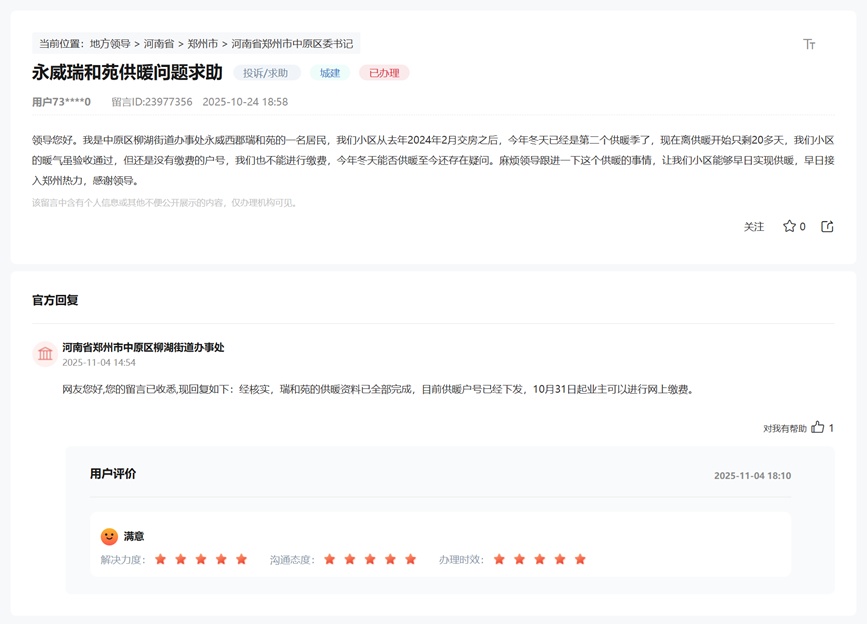 随着冬季的到来,寒冷更加强烈,人们的取暖、供气、出行安全等日常生活安全需求增加。近日,河南省各地《人民日报》领导公告栏上出现了“没有家庭电话就交不了暖气费”、“没有天然气就不能用热水”、“经常洒水路面湿滑不安全”等多个话题。当地有关部门接到电话后,及时回应群众关切,积极采取措施,确保民生保障。单击可显示相关消息。家庭供暖号码将在适当的时候发布。房主们也能安心地迎接冬天。 “只剩下20天供暖了,但我们还没有收到家庭供暖的付款号码,今年冬天会按计划供暖吗?”近日,瑞和园的居民们,郑州市中原区流湖分局永威西县,充满了焦虑。社区移交工作定于2024年2月进行,今年标志着第二个供暖季的开始。社区供暖虽然通过了验收,但未开具付款账号,导致业主难以完成付款,供暖问题悬而未决。市民通过短信渠道反映诉求后,中原区流湖区办立即介入核实。瑞和园小区所有相关供暖信息均已确认,门牌号已正式下发。家派。业主现在可以通过网上渠道完成付款,消除了居民冬季没有暖气的担忧。多个利益相关方共同努力打破僵局,找到解决国内天然气问题的办法。 “我来到这里已经快一个月了“我已经付清了所有的房产费用,但无法使用天然气。”近日,商丘市泉泉县的一位居民通过公告牌求助。“天气越来越冷,缺少天然气和热水,对于80多岁的父母来说非常困难。希望有关部门尽快解决问题。”[相关消息]接到此消息后,民权县政府立即责令民权县开发投资有限公司进行调查。书面答复称,经过与民权县住房和城乡建设办、开发投资有限公司、燃气公司沟通协商,最终达成一致解决方案。业主已完成房屋装修。如果是这样,可以先去当地房产公司了解情况。屋村服务中心收到燃气启动通知书后,持通知到燃气公司办理登记配给及开户手续,让您顺利开启天然气,满足您的日常需求。科学优化灌溉作业,兼顾环境保护和出行安全。 “最近雨下得很大,天气越来越冷,洒水车每天都在喷水,路面湿滑,开车困难。”长原市市民反映,近期洒水车频繁运行,导致道路长时间潮湿,给居民带来很大不便,尤其是在雨天或早晚高峰时段灌溉时。 【相关帖子】针对公众的投诉,长原市委立即责令市管理办公室采取行动。书面回复解释了灌溉工程的初衷,并针对公众关心的问题透露了一系列优化和调整措施。随着冬季的到来,灌溉频率cy will be strictly based on temperature changes and actual road conditions, and the irrigation frequency will be reasonably reduced to prioritize the safety of people's movement.同时,灵活调整运营时间,避免早晚交通拥堵。 The hoursdisplacement tip will reduce interference with public movement.我们要求洒水车驾驶员驾驶时更加小心,主动避让过往行人和车辆,并根据路段车流量和路面情况灵活调节洒水车水压,避免路面积水过多。此外,下班后将组织人工清除道路上积水或自然形成的积水。及时清洁,以利于清除积水,保证路面干燥。我们将在管控的同时,全力保障全体公民出行的安全舒适灰尘。公众利益无小事。必须解决哪些困难?在人民网“领导公告栏”上留言,诉说你的困难和担忧。
