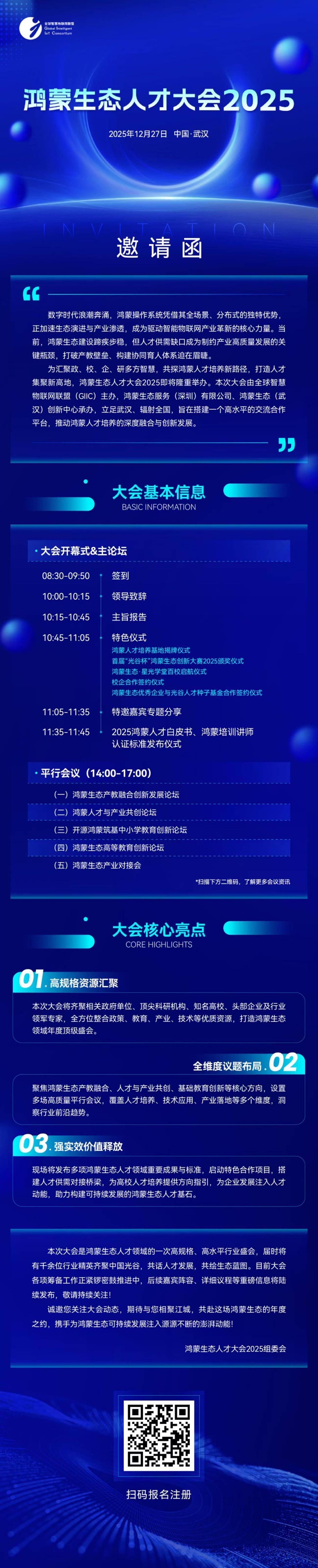 湖北日报讯(记者张珍珍)2025鸿蒙绿色人才大会将于12月27日在武汉光谷谷举行。本次大会以“新生态、新人才、新动能”为主题,由全球智能物联网联盟(GIIC)主办,鸿蒙生态服务(深圳)有限公司、鸿蒙生态(武汉)创新中心协办。拟邀请鸿蒙人才产业链上下游全生态,共同探讨鸿蒙人才发展体系建设,探讨产业生态合作发展新路径。作为鸿蒙绿色人力资源领域的年度盛会,本次大会将汇聚学术权威、行业领袖、政府代表等重要嘉宾,围绕技术创新等核心话题进行分享。鸿蒙企业、绿色人力资源发展战略及行业人力资源规划主题演讲中的许可。签约仪式和颁奖仪式将包括鸿蒙人才培养基地揭牌仪式、2025第一届鸿蒙生态创新大赛“光蒙杯”颁奖仪式、鸿蒙生态星光馆百所学校揭牌仪式、校企合作签约仪式、鸿蒙生态优秀企业与广蒙人才种子基金合作签约仪式等。其中,鸿蒙人力资源开发中心将设在鸿蒙(武汉)绿色创新中心内,该中心是全国规模最大、设备最先进、功能最齐全的。该中心自2024年12月开始运营以来,已培养了1000多名鸿蒙人才,成为武汉国家鸿蒙产业山建设的核心力量。会议还将举办围绕“鸿蒙生态工业教育融合创新发展”、“鸿蒙+产业人才培养”、“开发者创新”、“鸿蒙基金会开源建设中小学教育创新”等多个垂直领域分论坛,精准满足不同群体需求。其中,鸿蒙课程体系将在鸿蒙大学人力资源发展分论坛发布,并向鸿蒙大学大使和布道者发放许可证。值得注意的是,本次大会将公布《鸿蒙人力资源白皮书2025》和培训认证标准,公布了两大行业成果,为鸿蒙绿色人才培养提供规范指导和规范参考。同时,户外还将设立专门的生态人才展示区,全景展示鸿蒙取得的成就产学融合、教材、创新竞赛等领域的操作系统。现场还将设有互动开发者体验区,提供代码拼图、Codelab、AI编程等有趣的互动项目。当前,武汉“一城三廊一区”科技创新布局正在加速推进,光电信息、集成电路等战略性新兴产业正在加速崛起。作为经济数字化的重要基础设施,鸿蒙生态系统的人力资源开发和产业发展与武汉产业推进需求紧密契合。武汉市率先发布全国首个市级开源鸿蒙建设实施方案,明确实施开源人才集聚工程,壮大从业者队伍,培养后备人才,鼓励武汉大学、华中大学科技大学、武汉科技大学等高校共建开源教育教育体系,开展鸿蒙人才培养专项行动。到2027年,我们计划聚集10万名开源开发者,共同壮大产业生态。东湖高新区近期发布的《D区“e东湖高新区优秀人才(团队)特别实施办法》(即《光谷拔尖人才政策》)与鸿蒙的人才培养生态设计非常吻合,都是锚定人才,人才驱动发展的核心是教育方向、合作模式和发展目标的深度契合。在光谷,我们通过“名单公开”、“人才引进”等灵活机制引进人才。 “校企合作”,提供融资、住房、服务等多方位支持。鸿蒙大学人才发展论坛、万人开发者计划和校企合作办学模式推出的课程体系,共同构建“人才发展与产业引进”的完整闭环。作为数字经济的核心基础,鸿蒙操作系统正在成为促进国家高度科技自主、培育新生产力的重要支撑。人力资源是决定鸿蒙生态发展深度的核心因素。很简单。本次大会将进一步增强武汉鸿蒙生态对华中地区的核心辐射力,为武汉建设国家科技创新中心打造强大的人才基础,为鸿蒙生态在全国的发展注入核心动力。